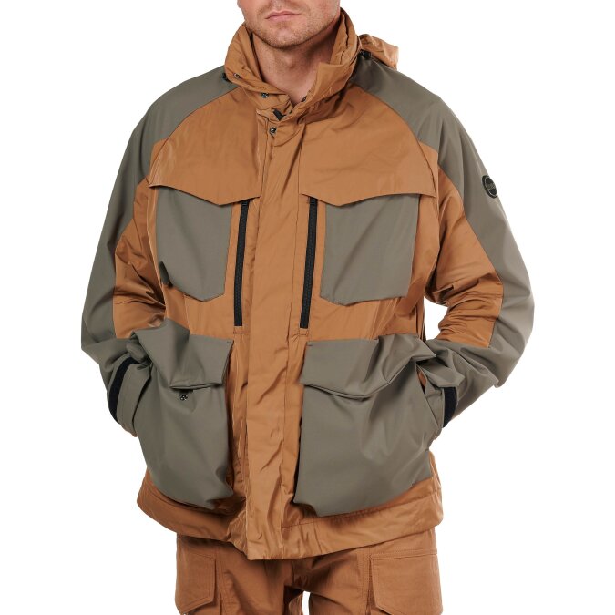 Полевая куртка выполненная в стиле колорблок от COLMAR в коллаборации с Yosuke Aizava шеф дизайнером WHITE MOUNTAINEERING из технической ткани с водооталкивающим покрытием накладными карманами и скрытыми нагрудными карманами. Можно компоновать с брюками карго из аналогичной ткани этого же бренда.
