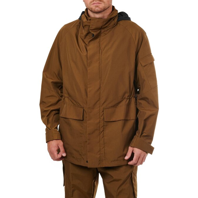 Парка HEVO из технологичной водоотталкивающей ткани с накладными карманами и капюшоном в воротнике. Возможно компоновать в костюм с брюками TORREMIGGANO из аналогичной ткани этого же бренда.
