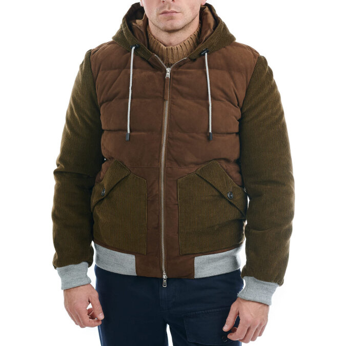Укороченный бомбер от L.B.M.1911 выполнен из замши и вельвета с капюшоном. Наполнитель пух/перо.